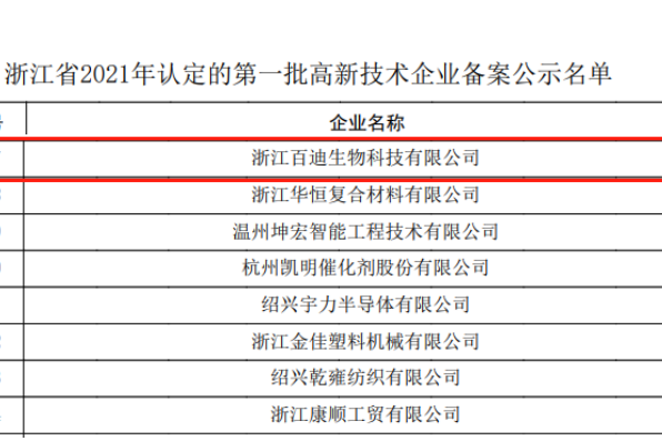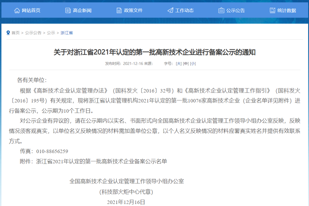 2021年12月底,全国高新技术企业认定管理工作领导小组办公室公布了《关于对浙江省2021年认定的第一批高新技术企业进行备案公示的通知》。